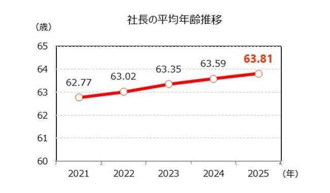 都道府県別では、最高は秋田県の66.31歳で、5年連続で最高となった。一方、最年少は2年連続で広島県62.82歳だった。事業承継の遅れから、社長の高齢化に歯止めがかかっていない。